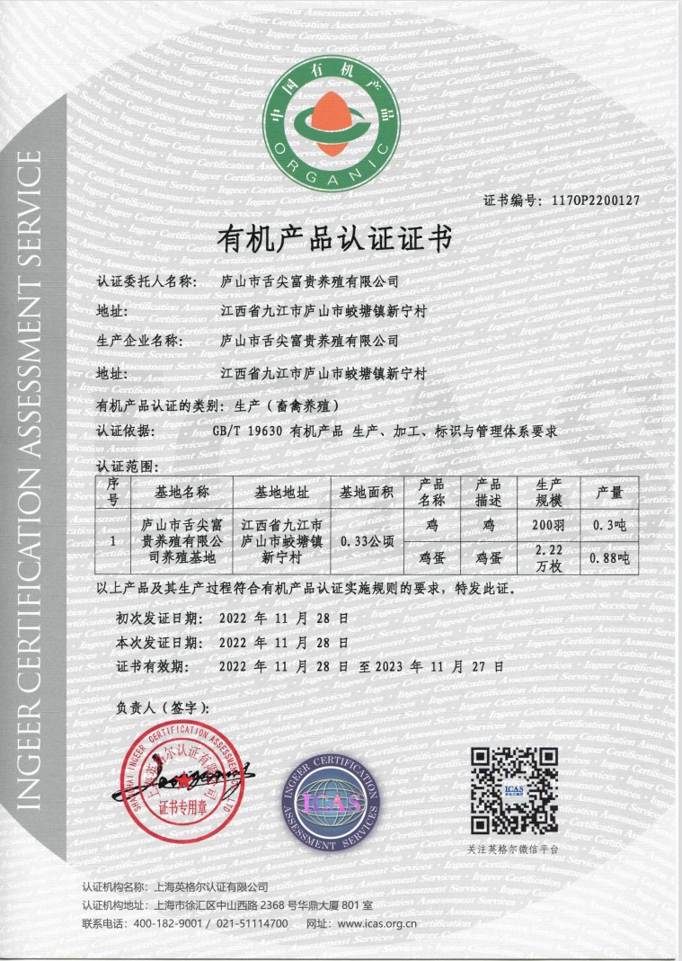 为联盛超市供给洋鸡蛋的庐山市舌尖富贵养殖场,其鸡蛋产品已获得富硒产品认证及有机产品认证,从生产到联盛超市上架售卖最快可达24小时,新鲜干净,单个克重在55-60g的大蛋,价格亲民,是老百姓选择和信赖联盛超市的因素之一。