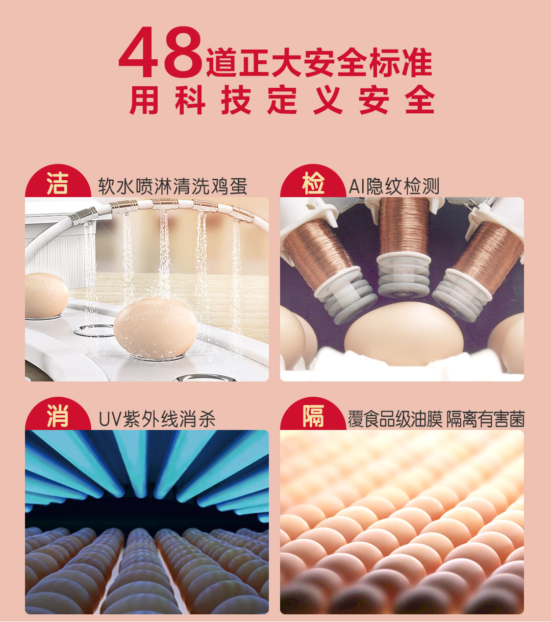 同时附以编码“身份认证”,产蛋日期即生产日期,让每一枚鸡蛋都有其品质安全证明,做到品质可溯源,优质看得见,全程0人工接触,生产、物流完全自动化,打开包装,您就是第一个碰到它的人。