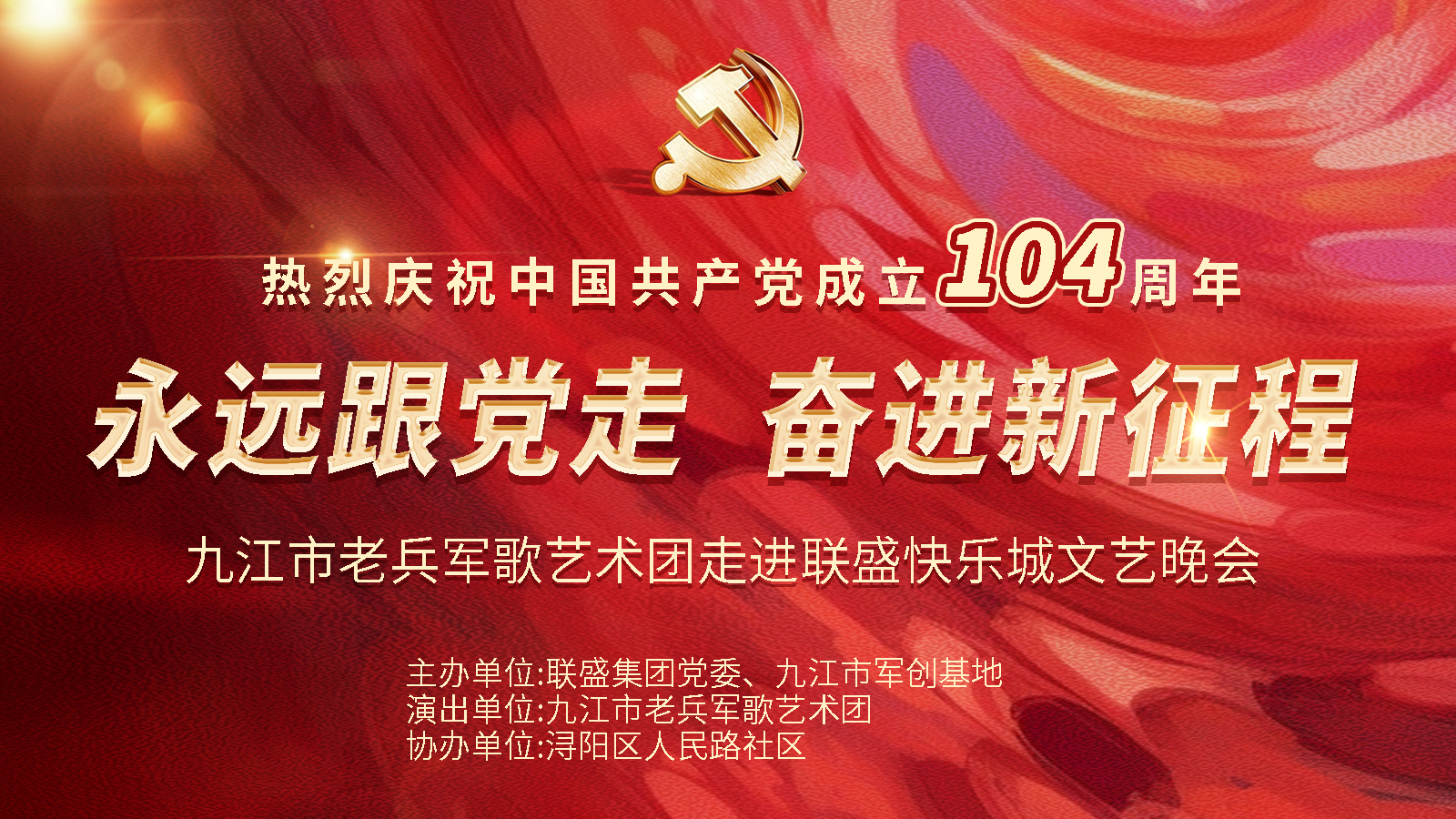 2025年7月1日,由联盛党委主办,九江市军创基地,九江市人民路社区协办,九江市军歌艺术团承办的《永远跟党走,奋进新征程》庆祝中国共产党成立104周年文艺晚会在联盛九江快乐城成功举行!九江市军创基地政委郑锋、副主任金波、联盛集团董事长严永敏、联盛集团党委书记、副总裁陈刚等参加活动。
